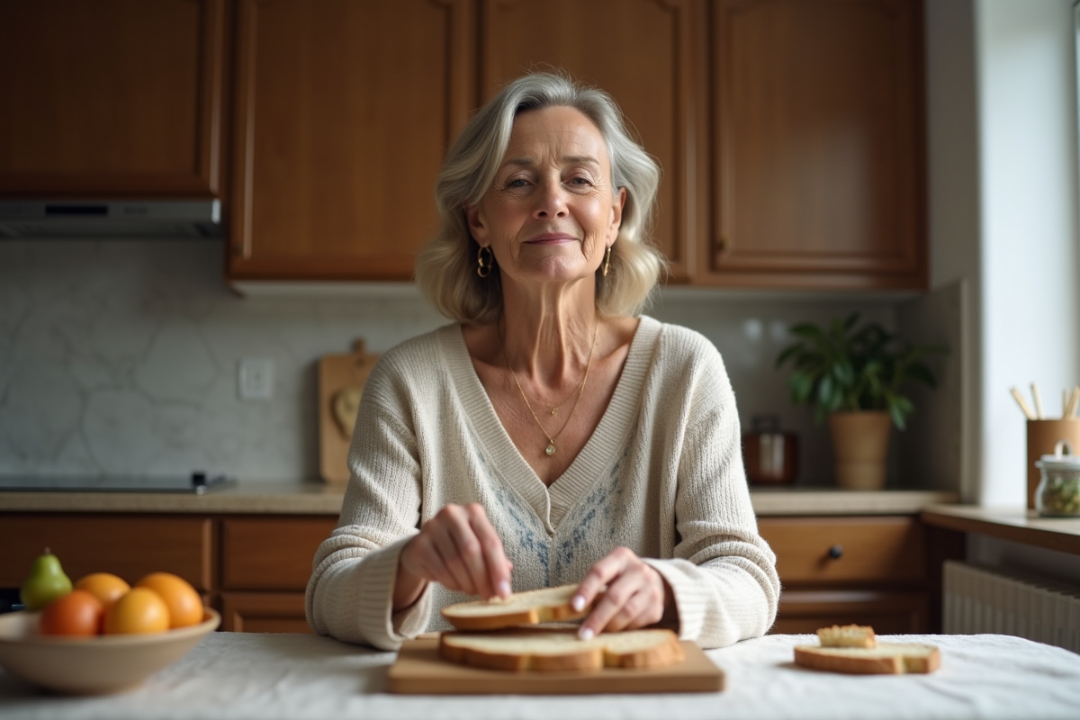 Femme d'âge moyen étalant une tranche de pain complet dans la cuisine